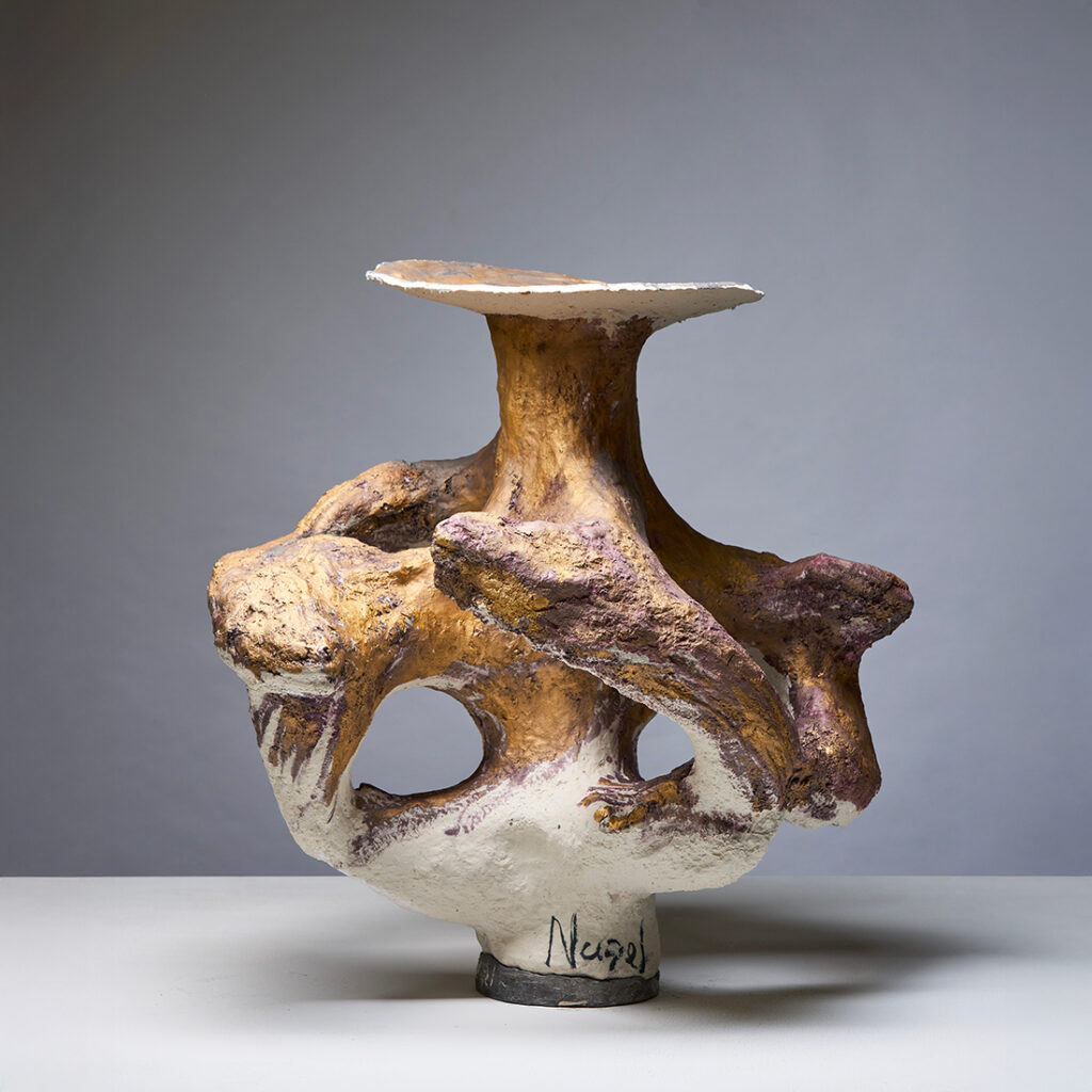 Johannes Nagel réinvente le vase par excavation : il creuse le sable à main nue, coule la barbotine et laisse naître des volumes “découverts” plus que façonnés. Entre influences japonaises, héritage du Bauhaus et énergie californienne (Voulkos, Kaneko), il compose une céramique d’improvisation maîtrisée.